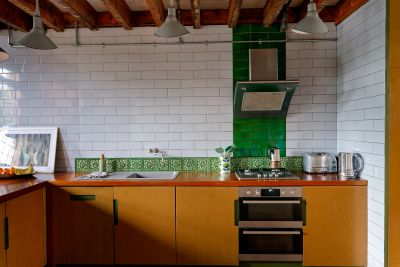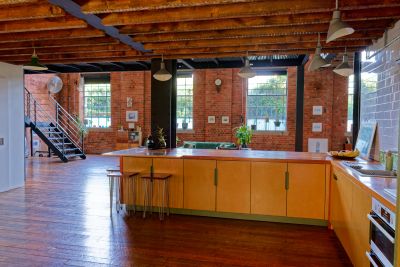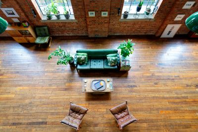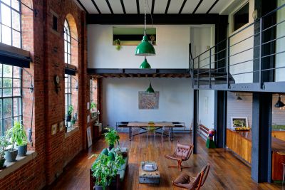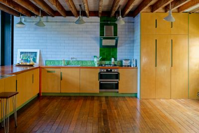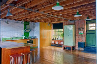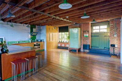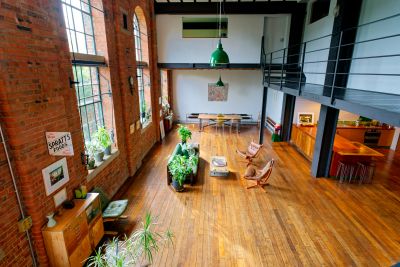 3000 square foot warehouse conversion set over 3 floors. Ground floor access, double height ceilings in the reception. Ability to shoot from above. Kitchen has been refurbished to be fully modular - there is a large bank of cabinets which separates the kitchen and reception area. This is on wheels, and can be moved anywhere- effectively opening the space between kitchen and living room completely, or creating a kitchen island.