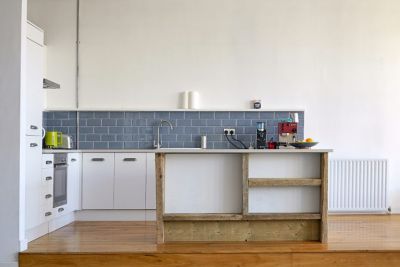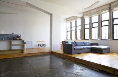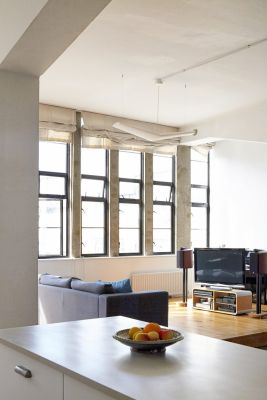 Minimalistic loft space – open plan kitchen, living and dining area with one bedroom within the space. Total space is over 2200 sq ft if including the mezzanines.
