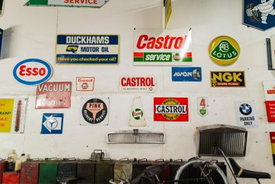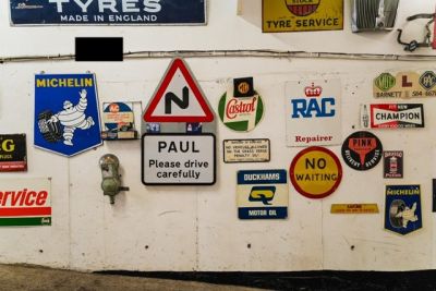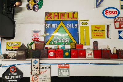 This underground car park is full of genuine car memorabilia and a varied selection of motor vehicles, motor bikes, bicycles, toy car collections, for sale or use as props.